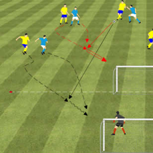 Der Gassenpass sorgt für Raumgewinn und als Pass in die Tiefe für Torgefahr oder wir gelangen in den Rücken der Abwehr. In der dargestellten, offensiven Spielform entscheiden die Spieler, ob sie mit dem Kurz- oder Gassenpass zum Torerfolg kommen. Sie werden den Pass in die Tiefe suchen, denn dort herrscht geringerer Gegnerdruck und zusätzlich zählt ein Tor doppelt.