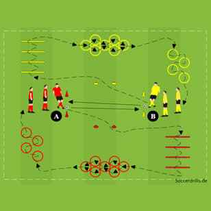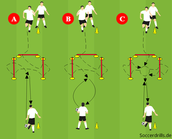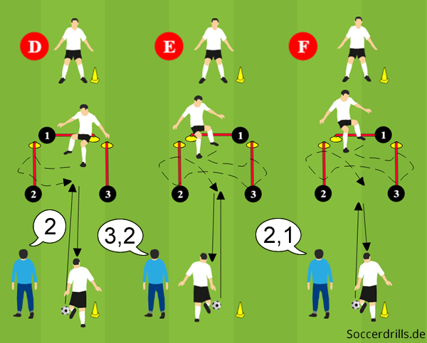 In den Abläufen unserer Beispielübungen, insbesondere D bis F, sollen sich die Akteure schnellstmöglich auf unerwartete Gegebenheiten einstellen, ohne dabei das Ziel der Übung, den Pass, zu vernachlässigen. Die Bewegungen im Rechteck sind gut gesteuert einzusetzen, denn durch Bewegungsgenauigkeit steigern wir die Schnelligkeit und das Körpergleichgewicht ist beim Überqueren der Hürden schnell wiederherzustellen. All dies funktioniert nur mit einem eigenen Bewegungsrhythmus, der sich mit zunehmender Übungsdauer weiter entwickeln wird.