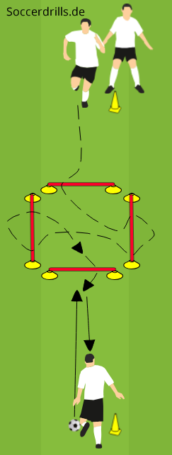 Der Passgeber soll antizipieren, wann der günstigste Zeitpunkt für den Pass ins Rechteck ist. Insbesondere bei der Wettkampfvariante kann die Aktion schneller beendet werden, denn kommt der Pass zu früh, geht er schlimmstenfalls verloren, kommt er zu spät, steht der Mitspieler unnötig rum.