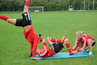Nein, auf keinen Fall. Der Sinn des funktionellen Warm-ups ist das zielgerichtete Vorbereiten auf das nachfolgende Training oder Spiel. Abgesehen von physiologischen Aspekten sollen vor allem aktive und passive Strukturen wie Muskelketten mit sämtlichen Sehnen, Bändern und Gelenken bewusst angesteuert werden. Diese Bewegungsabläufe sind bei Männern und Frauen identisch und können somit auch auf die gleiche Art und Weise trainiert werden.