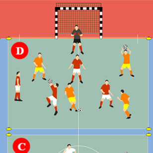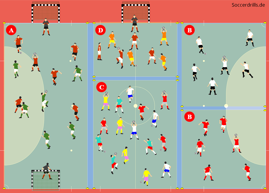 Wir lassen diese Spielform auf zwei Toren laufen. Stehen diese nicht zur Verfügung oder du benötigst weitere Felder und es sind nicht ausreichend Torhüter vorhanden, kann natürlich auch auf ein Tor gespielt werden.