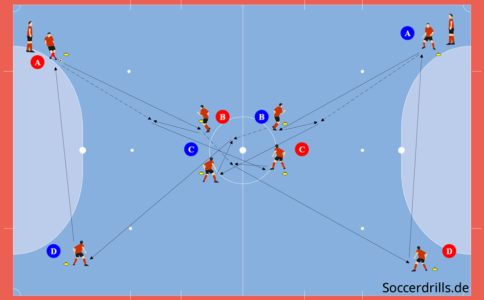 In der Soccerdrills-Rubrik zum Futsal findest du Grundübungen zum Futsal-Training. Hier, im Thema Passen und Orientierung, vertiefen wir die Grundlagen zu den Passtechniken und fordern zusätzlich eine gute Raumaufteilung, nur so laufen die Übungen reibungslos ab. Die Übungen sind praxiserprobt und sowohl beim Aufwärmen als auch in den Hauptteilen für alle Alters- und Leistungsklassen geeignet. Voraussetzung sind technische Grundfertigkeiten im Passen und der Ballkontrolle.