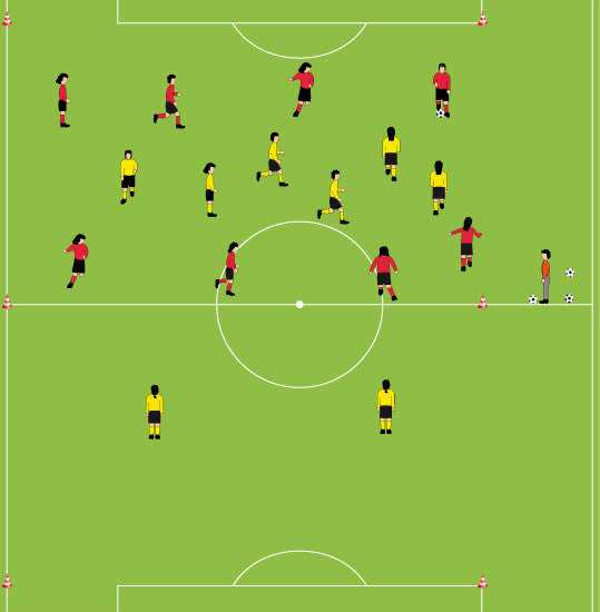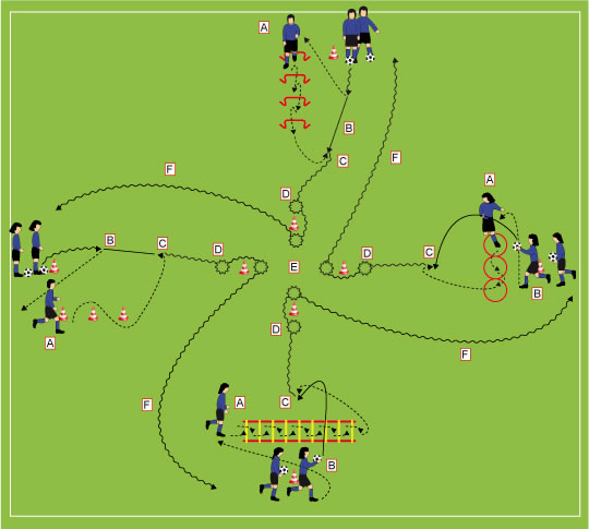 11 Hütchen, pro Spielerin einen Ball, Koordinationsleiter, Reifen, Minihürden...