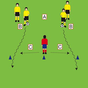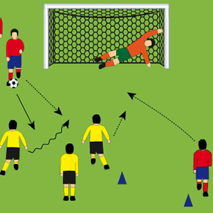 Wir haben bei unseren Trainingseinheiten auch eine komplette Einheit zum Thema "Hinterlaufen". Dort könnte die erste Übung des Hauptteils auch eingefügt werden, passt hier aber deshalb so gut, weil der ballführende Spieler sich entscheiden muss, ob er am Verteidiger vorbeizieht oder besser abspielt. In der zweiten Übung steht der Angreifer wieder vor dieser schweren Entscheidung. Mache deinen Spielern bewusst, worum es in diesen Übungen geht, denn oft meinen die Spieler, es geht hier nur um den Zweikampf, dabei geht es hier um mehr: die richtige Entscheidung!