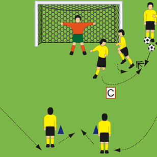 Hilfsmittel: 8 Markierungen, 2 Hütchen, 1 Tor