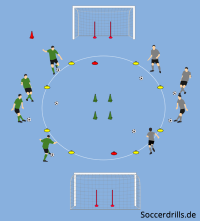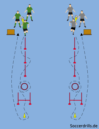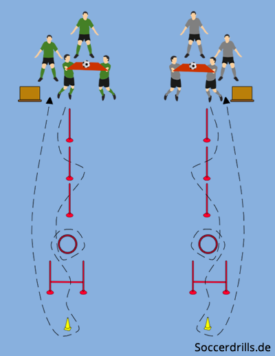 - Bilde kleine Mannschaften, fünf Spieler pro Team sind genug. Solltest du eine hohe Trainingsbeteiligung haben, dann gibt es folgende Variante: Interessant wird es auch, wenn nur ein Parcours für beide Teams zur Verfügung steht. So wird es deutlich enger und noch schwieriger.