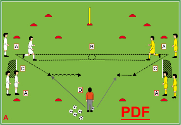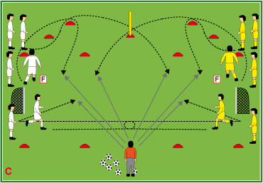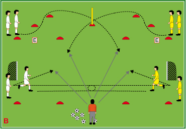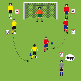 Der Trainer passt wie beim "Meeting" einen Spieler an, bestenfalls den schnellsten Sprinter der vier Beteiligten. Der Passempfänger versucht sofort mit seinem Mitspieler ein Tor zu erzielen. Du kannst dabei mindestens einen oder sogar zwei Pässe fordern, oder deinen Spielern die Entscheidung total überlassen, wie sie ein schnelles Tor erzielen.