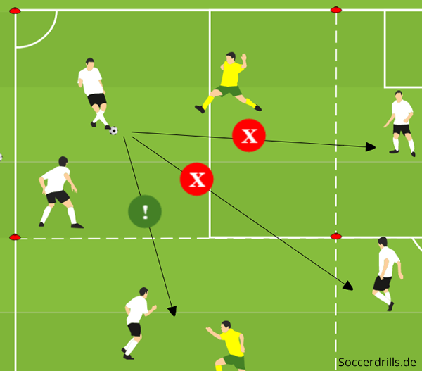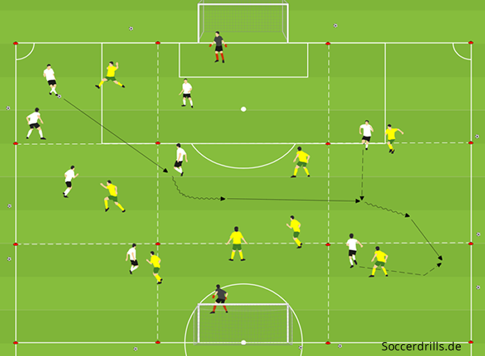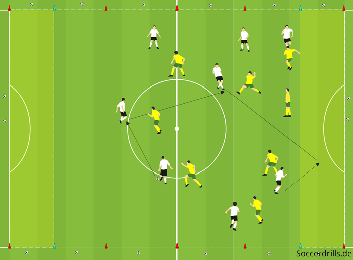 Weiterhin kannst du bereits im Ausdauertraining technische oder taktische Lernziele verfolgen. Kurzpassspiel, Spiel in die Tiefe, Passspiel mit dem Innen- und Außenrist, Flugbälle, Flügelspiel, der Einbau vieler Elemente ist möglich.