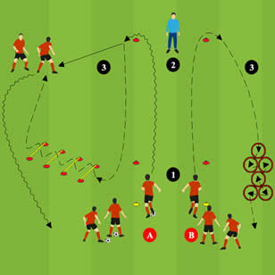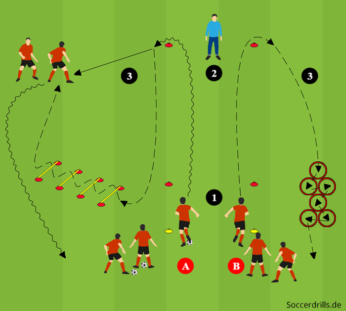 - A = Der Spieler passt zum Passempfänger und sprintet anschließend zu den Minihürden. Diese überspringt oder durchläuft er nach Bewegungsvorgabe und übernimmt die Position des Passempfängers. Der Passempfänger dribbelt in die Startgruppe.