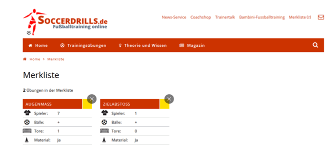 Mit der Soccerdrills-Merkliste kann du dir deine ganz persönliche Übungsauswahl zusammenstellen.