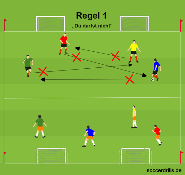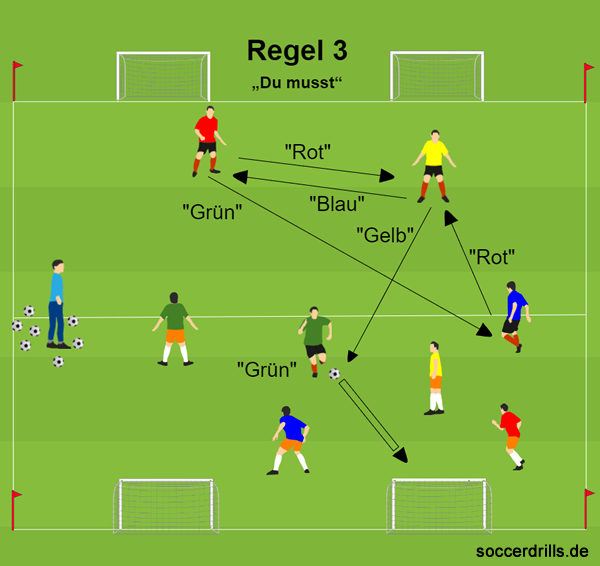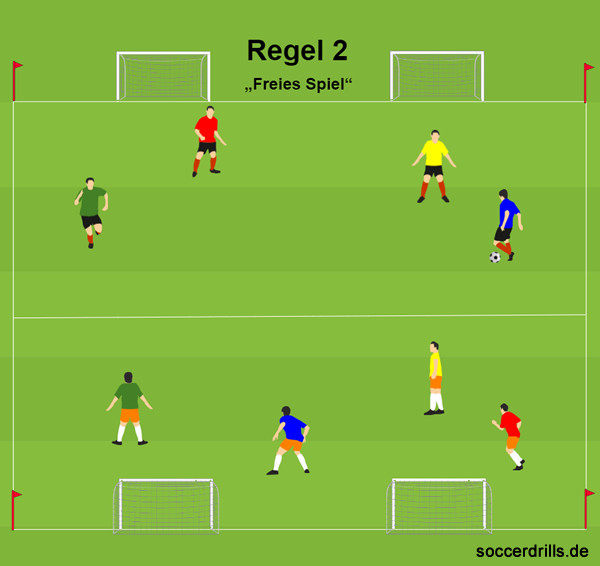 - Beide Teams haben jeweils einen Spieler in grünen – gelben – roten – blauen Leibchen.