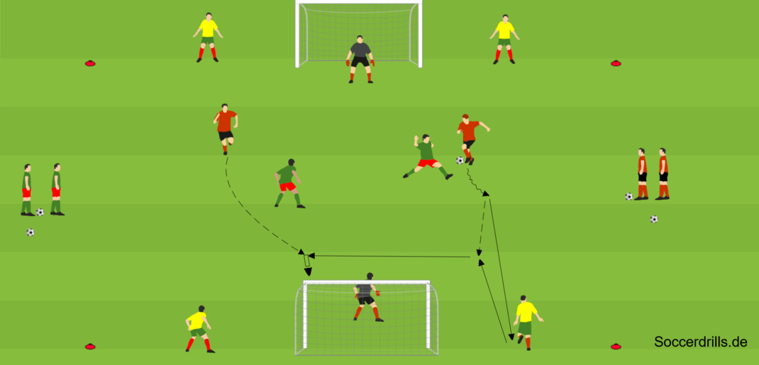 - Jeweils links und rechts neben den Toren wird ein Anspieler postiert, also insgesamt 4 Anspieler pro Feld.
