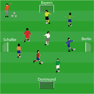 - Zunächst geben wir den vier Toren Namen, zum Beispiel: Bayern, Dortmund, Berlin und Schalke