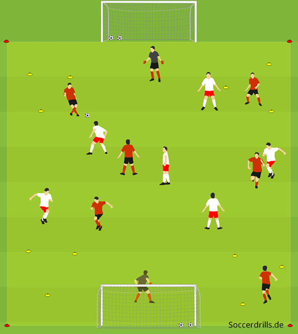 Die ballbesitzende Mannschaft spielt in Überzahl, denn beide Torhüter gehören zum Team. Der Torabschluss wird noch nicht gesucht, denn erst müssen zwei Dreiecke bespielt werden, dies gelingt am besten mit präziser Ballzirkulation. Schafft die ballbesitzende Mannschaft dies, sind die Tore freigeschaltet und auf das, vom letzten bespielten Dreieck am weitesten entfernte Tor wird angegriffen.