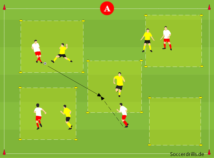 Für die Spielform wurden gleich zwei unterschiedliche Spielfelder entwickelt. Auf einem Spielfeld befinden sich die freien Räume in der Breite und Diagonalen, die Passwege können dadurch deutlich länger sein. Das andere Spielfeld wurde so konzipiert, dass die Räume sich überall befinden können. Unsere Darstellung ist ein Vorschlag und du kannst das Spielfeld individuell anpassen. Achte lediglich darauf, dass die Spielfelder nicht zu groß sind, Kurzpassspiel ist ein wichtiger Bestandteil.
