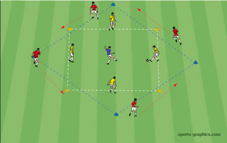 Zwei Mannschaften mit je 4 Spielern und 1 neutraler Spieler. Alle Spieler bis auf den neutralen Spieler werden nummeriert (1 bis 4). Die eine Mannschaft lässt im gelben Viereck den Ball mit dem neutralen Spieler laufen, während die andere Mannschaft um die blauen Hütchen läuft. Nach 5 Pässen versuchen die roten Spieler mit den Nummern 1, 2 und 3 den Ball zu erobern. Nach weiteren 5 Kontakten darf der vierte rote Spieler auch mithelfen. 5 Pässe ergeben einen Punkt.