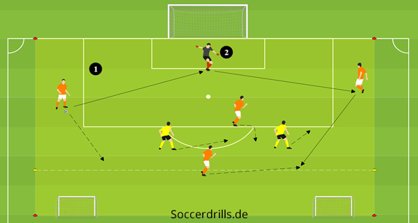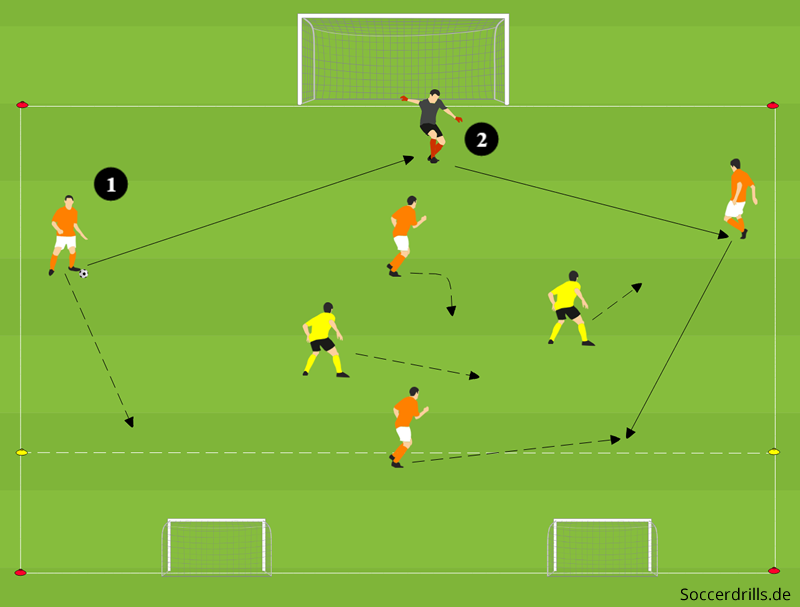 In unserer Spielform geht es darum, neben der Umsetzung der technischen Fertigkeiten, welche Spieleröffnung der Torwart wählt. Er hat vier Anspielmöglichkeiten und muss dabei die Positionen der beiden Gegenspieler beachten. Idealerweise passt er den Ball direkt in die Spitze auf den 9er und ist dies nicht möglich, hat er drei Passalternativen. Wird er von einem Gegenspieler attackiert, werden die Räume für die Passspiele größer, aber nur dann, wenn seine Mitspieler sich entsprechend anbieten. Dazu ist ständiges Bewegen erforderlich und die Grundkenntnisse des Lösens aus dem Deckungsschatten müssen bekannt sein.