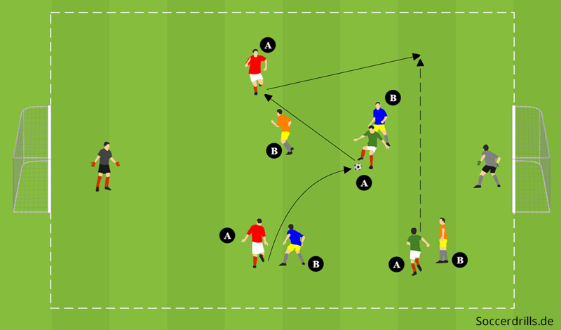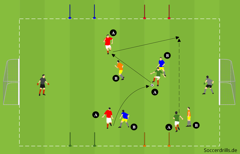 Diese Spielform ist etwas komplexer und beinhaltet als Lerninhalte … spätesten in den Varianten, neben Passen, Anbieten und Freilaufen, das Dribbling, die Wahrnehmung und Orientierung, die Ballan- und mitnahme und die Handlungsschnelligkeit.