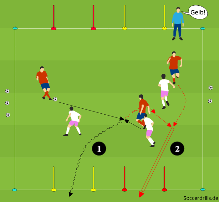 - Kommt das Signal „Gelb!“ gilt für ein Team dribbelnd das gelbe Stangentor zu durchqueren, durchs rote darf gepasst/geschossen werden. Beim anderen Team ist es genau umgekehrt. Vorher wird natürlich festgelegt, welches Team durchs aufgerufene Tor dribbelt und welches passt/schießt.