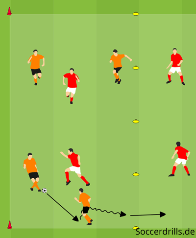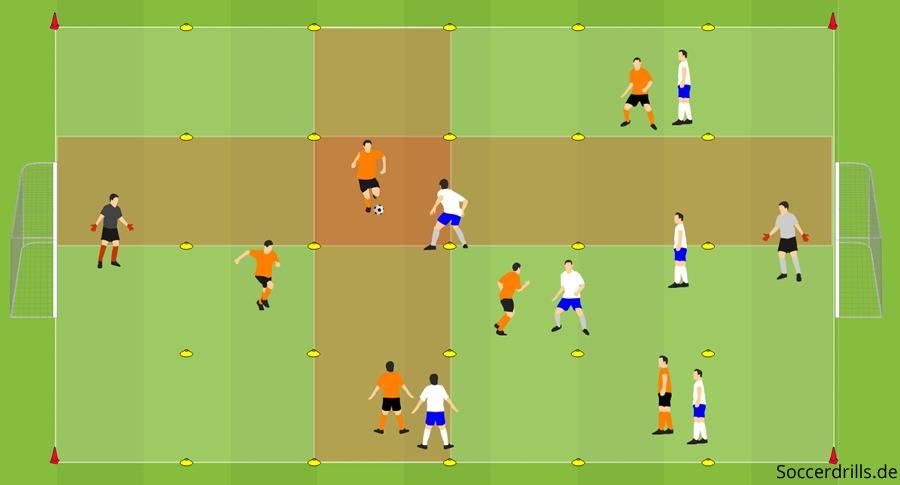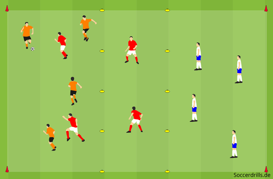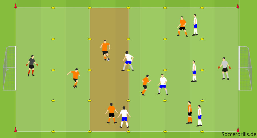 Die hier vorgestellten Spielformen orientieren sich am Offensivspiel und die Teams versuchen, den Ball sicher in die andere Spielfeldhälfte zu transportieren. In der Verbotszonen-Spielformen kommen dann Tore hinzu, der Druck auf die Spieler wird deutlich erhöht. Gute Ballzirkulation, enge Ballführung und im richtigen Moment aufdrehen sind gefordert. Dazu gehören dann das Erkennen und das Einnehmen von freien Räumen, möglichst im Rücken der Verteidigung.