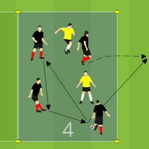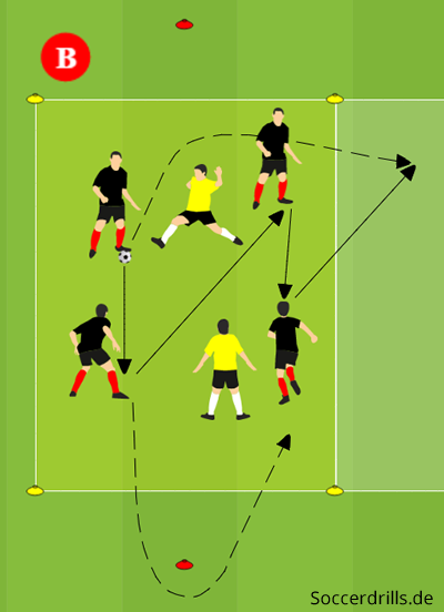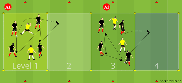 Die ballbesitzende Mannschaft versucht, mit Ballhalten und Passspiel und den daraus resultierenden sicheren Kombinationen, immer wieder Anspielstationen zu schaffen. Lücken zu suchen und einzunehmen, Dreiecke oder Rauten zu bilden. Die beiden Abwehrspieler stellen die Passwege zu, stören die Passkombinationen, pressen und doppeln im richtigen Moment.