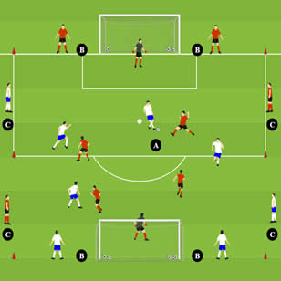 Wir starten die Übungsform auf einer Seite. Nach etwas Eingewöhnung erfolgt dann der Start gleichzeitig von der anderen Feldseite. Die Spieler werden im Ablauf angehalten, die Schnelligkeit der Dribblings und Passspiele zu erhöhen, um dann mit verschiedenen Schusstechniken abzuschließen.