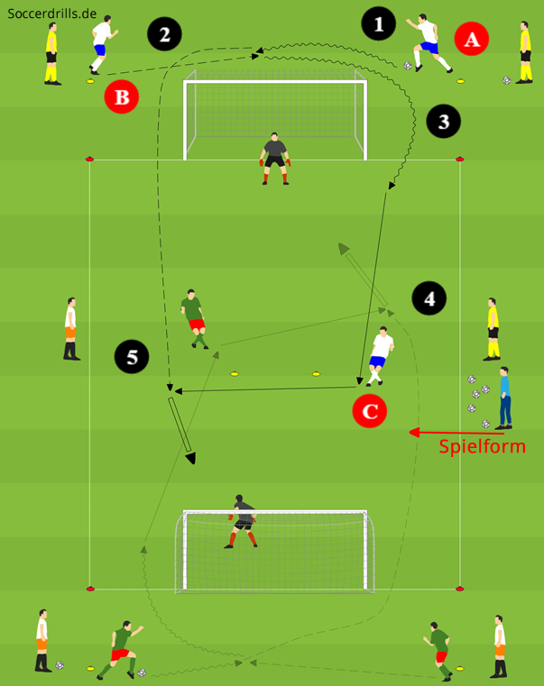Übungsform 3 gegen 0 - Dribbling, Ballübernahme, Passspiel und Torschuss