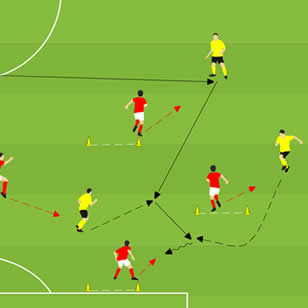 In dieser Spielform generieren wir Räume, die bewusst ohne Torabschluss erobert werden müssen. Durch die besonderen Spielregeln gibt es trotzdem ein Siegerteam, wenn geschickt die Räume erobert werden und das Kurzpassspiel präzise in den Lauf erfolgt. Es werden zwei Spielfelder angeboten, mit Grafiken und PDF.