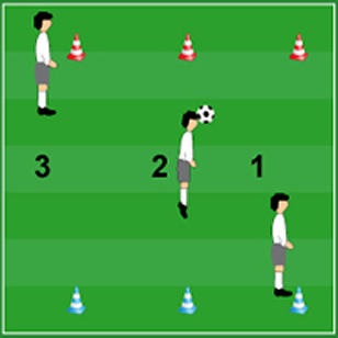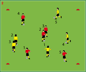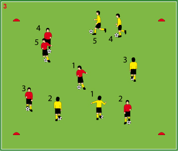 Übungsregel: Im Gegensatz zum klassischen Schattendribbling muss der Hintermann jetzt nicht die gleiche Finte wie der Vordermann nachmachen, sondern die Finte davor (Beispiel: Ruf "3", Finte 2 ausführen) und dann bei der nächsten Finte des Vordermanns die Finte danach (Beispiel: Ruf "3", Finte 4 ausführen) … usw.