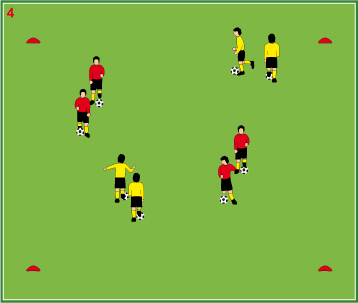 Bevor es los gehen kann, werden per Ansage die Zuordnungen nochmals trainiert. Die Spieler dribbeln frei im Raum, der Trainer ruft eine Zahl von 1 bis 4 und die entsprechende Finte wird unverzüglich ausgeführt.