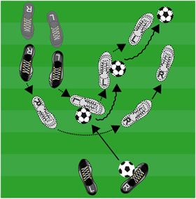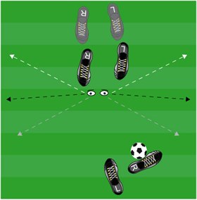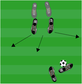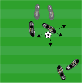 Dies bedeutet aber auch, den Ball immer mit dem vom Gegner entfernten Fuß annehmen (siehe "Fußregel") und führen. Steht der Spieler frontal mit dem Ball zum Gegenspieler, sollte er abspielen oder mit einer Finte versuchen den Gegner auszuspielen. Die sicherste Möglichkeit ist das Abspiel, aber wir sollten unseren Spielern immer erlauben risikobereit zu spielen und nicht ständig jedem Zweikampf aus dem Weg zu gehen.