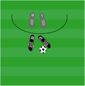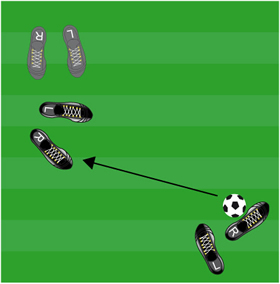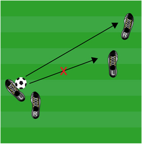 Abb. 01: Ein Pass auf eine Außenposition sollte immer in den Außenfuß gespielt werden, so kann der Passempfänger den Ball viel leichter verarbeiten, ins Tempodribbling starten oder weiterleiten.