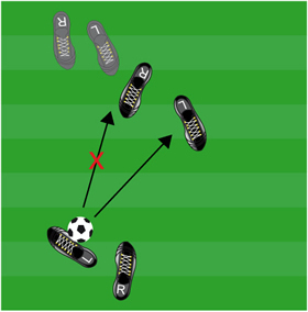 Abb. 02: Befindet sich der Passempfänger in einer zentralen Position und steht unter Gegnerdruck, erfolgt das Zuspiel in den gegnerfernen Fuß. Nur so wird vermieden, dass der Gegner den Pass attackieren kann, bevor der Ball kontrolliert wird.