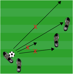 Nicht immer soll ein Pass in den starken Fuß des Mitspielers erfolgen, es sei denn man spielt zum Torwart zurück. Er sollte grundsätzlich in den starken Fuß angespielt werden, so vermeidet der Passgeber ungewollte Drucksituationen, Fehler bei der Ballannahme oder beim Rausschlagen des Balles durch den Torwart.