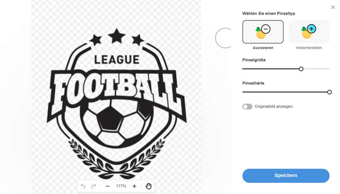 Dieser Online-Service macht den Hintergrund um Ihr Logo automatisch durchsichtig. Dazu müssen Sie ein Konto auf der Website des Tools erstellen und ein Bild hochladen, das das Firmenzeichen enthält. Danach erkennt diese Webanwendung automatisch den Typ des Objekts (im Fall des Logos sind es Grafiken) und entfernt alles Überflüssige um das Objekt herum. Falls die Bearbeitung nicht präzise genug ist, können Sie Pinsel benutzen. Mit dem Pinsel „Behalten“ können Sie ein Fragment des Logos markieren, das nach der automatischen Verarbeitung entfernt wurde. Dazu müssen Sie die Größe des Pinsels und das Objekt auf dem Originalbild sorgfältig auswählen. Der Pinsel „Löschen“ macht genau das Gegenteil. Wenn Sie mit dem Ergebnis zufrieden sind, können Sie Ihr transparentes Logo hochladen, indem Sie auf die Schaltfläche „Herunterladen“ in der oberen rechten Ecke klicken.