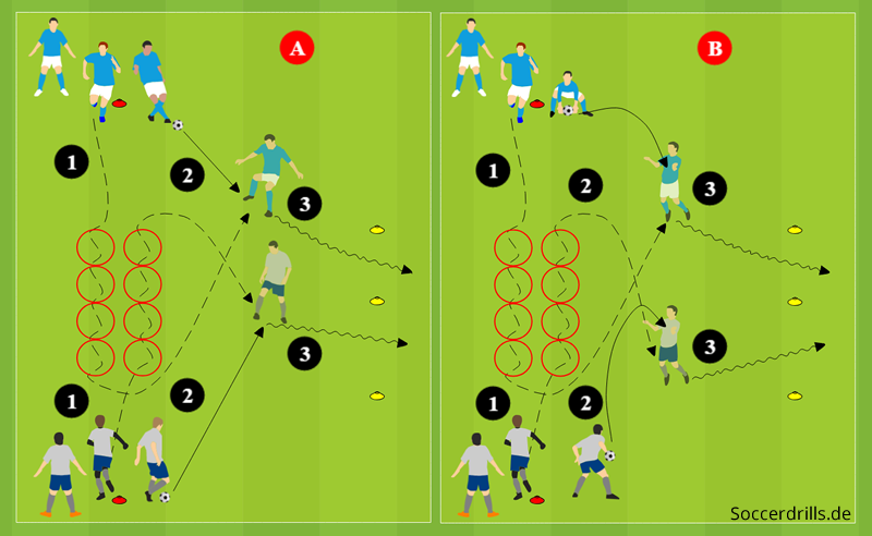 - Das Anspiel wird mit dem Rücken zu den Toren verarbeitet und in einer fließenden Bewegung blitzschnell durch ein Tor gedribbelt.