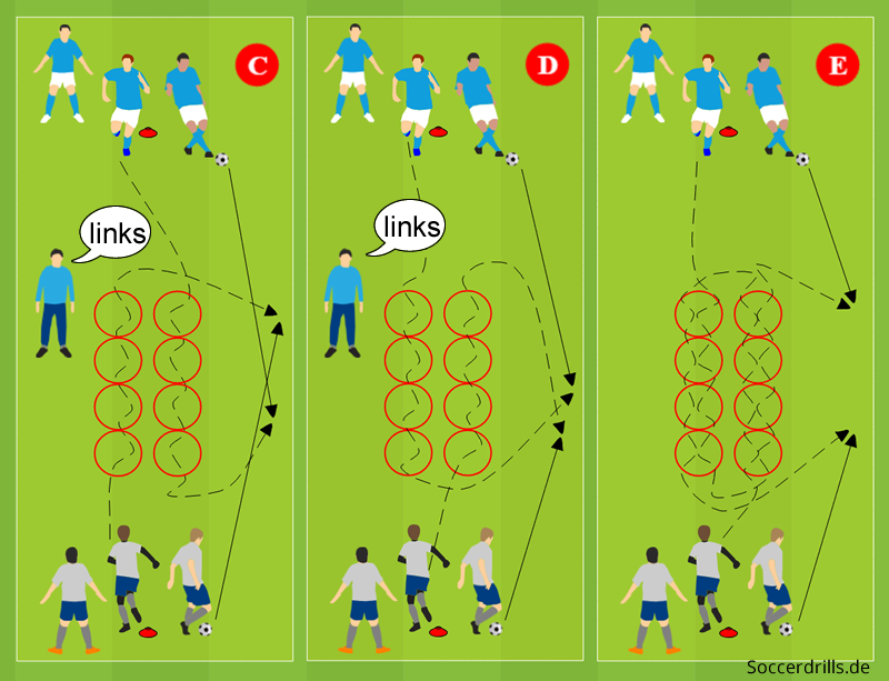 - Wie A und B, diesmal gibt der Trainer das Kommando „links“ oder „rechts“, entsprechend starten die Spieler durch die linke oder rechte Reifenreihe.