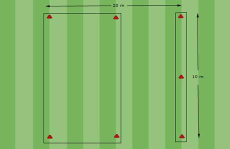 Jetzt werden die Gruppen getrennt – die Ersatzspieler den Torwart warm und die Startelf Feldspieler verteilen sich auf die Hütchen im großen Viereck (siehe Bild) so, dass bei den oberen beiden Hüttchen jeweils drei Spieler stehen und bei den beiden unteren Hüttchen jeweils zwei Spieler. Bei den Dreiergruppen haben wir jeweils einen Ball (pro Gruppe) und machen jetzt 3 verschiedene Passübungen (Beachte hierzu auch das Video):