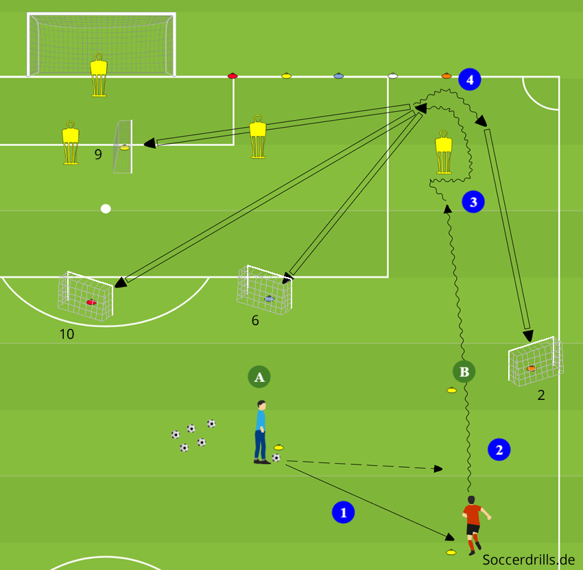 - Anschließend ruft der Trainer die Farbe einer Markierung in den Toren auf. Der Spieler passt sofort ins aufgerufene Tor.