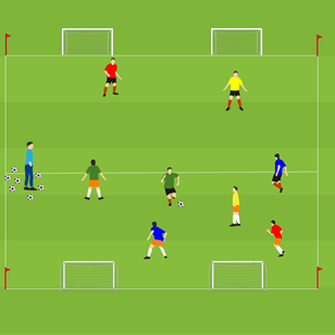 - Der Trainer oder ein Mitspieler passt seitlich zum Flügelspieler und setzt den Passempfänger sofort leicht unter Druck.