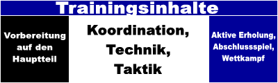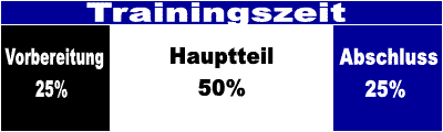 Die Trainingszeit teilt sich, wie in der Grafik dargestellt, in einen vorbereitenden Teil, in einen Hauptteil und einem abschließenden Teil auf. Die angegebenen Anteile in Prozent an der Trainingszeit sind Zirka-Angaben.