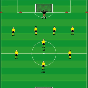 Wir ziehen in der Grundaufstellung die Nummer 8 aus der Raute auf die Position neben die Nummer 6 zurück. Aus dem Spiel in der Raute mit einem Sechser vor der Viererkette wird ein Spiel mit zwei Sechsern und so spielen wir 4-2-3-1 mit einer „Doppelsechs“.