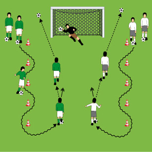 Unsere Spieler sollen jetzt den Ball zirkulieren lassen, auf den schnellen Weg zum gegnerischen Tor wird bewusst verzichtet. Es folgt das präzise Passspiel und dazu benötigen wir Anspielstationen. Der sichere Pass erhält immer den Vorzug vor dem Risikopass. Dabei können Positionen überspielt werden, was bedeutet, der Pass aus der hinteren Reihe kann in die Spitze erfolgen und so nutzen wir den vorderen Mitspieler vielleicht als Wandspieler, der den Ball ins Mittelfeld ablegen kann.