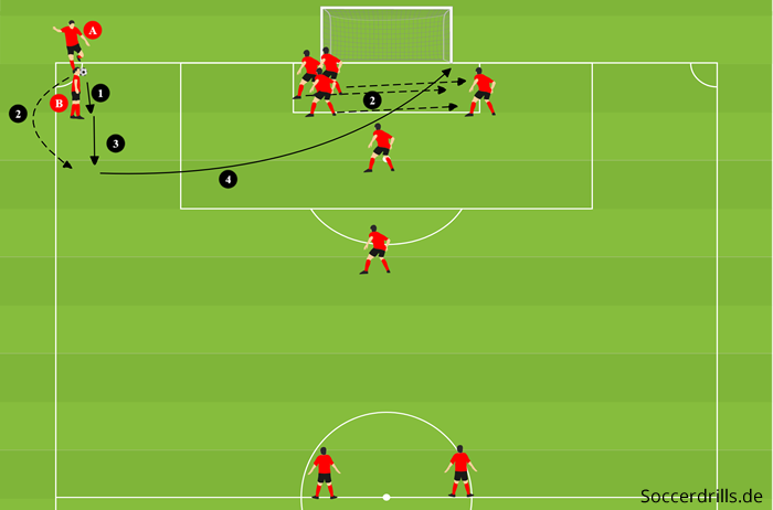 - A schlägt eine scharfe Flanke auf den zweiten Pfosten.