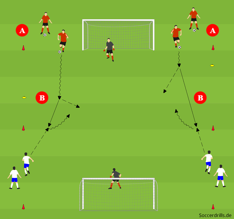 - Der Ablauf startet von beiden Übungsseiten gleichzeitig, nach der Aktion tauschen die Spieler die Aufgaben / schließen sich auf der anderen Seite an.