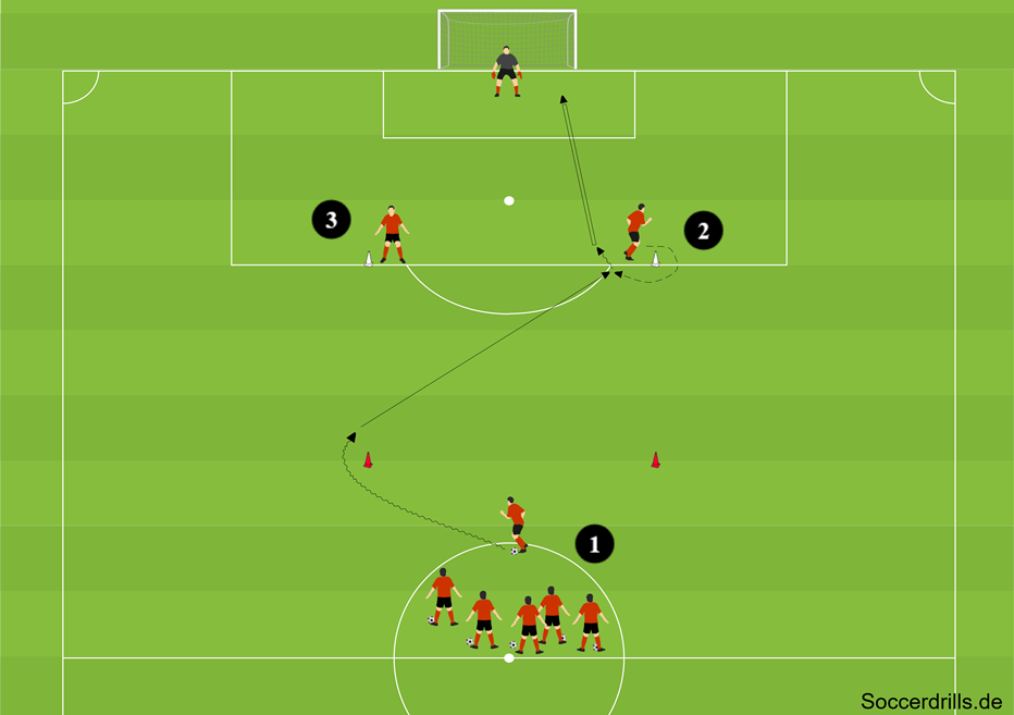 - Nach der Aktion übernimmt der Startspieler die freigewordene Position am Strafraum. Der Passempfänger holt einen Ball und schließt sich der Startgruppe an.