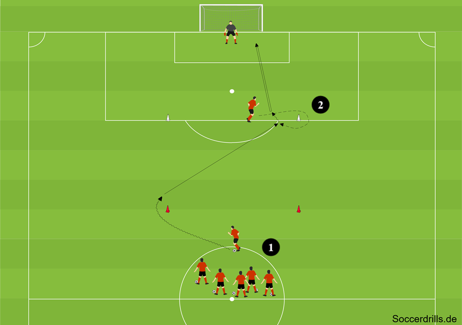 - (1) Aus der Startgruppe geht ein Spieler ins Dribbling in Richtung nächstes linkes oder rechtes Hütchen. Er entscheidet mit seinem Dribbling auf die rechte oder linke Seite, auf welcher Seite sich sein Mitspieler am Strafraum sich mit einer Auftaktbewegung anbietet.