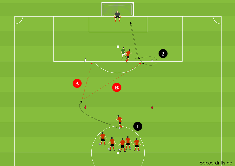 (B) … oder seinen Mitspieler am Strafraum anspielt, der sich mit einer Auftaktbewegung anbietet. Weiter geht es dann mit weiterem Passspiel oder dem direkten Zug zum Tor. Sobald der Ball die Linie zwischen den Hütchen überquert, ist der Abwehrspieler aus dem Spiel raus. - Nach der Aktion übernimmt der Startspieler die freigewordene Angreifer-Position am Strafraum. Sein Mitspieler wird zum Abwehrspieler und der Abwehrspieler holt den Ball und schließt sich der Startgruppe an.