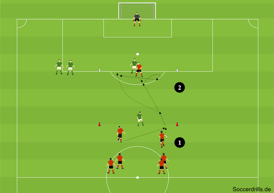 - Ein Passempfänger mit Gegenspieler am Strafraum (siehe Grafik: Diagonalspiel – 2 gegen 1).