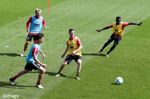 - Der Startspieler entscheidet mit seinem Dribbling auf die rechte oder linke Seite, welcher der beiden Spieler am Strafraum sich mit einer Auftaktbewegung anbietet.